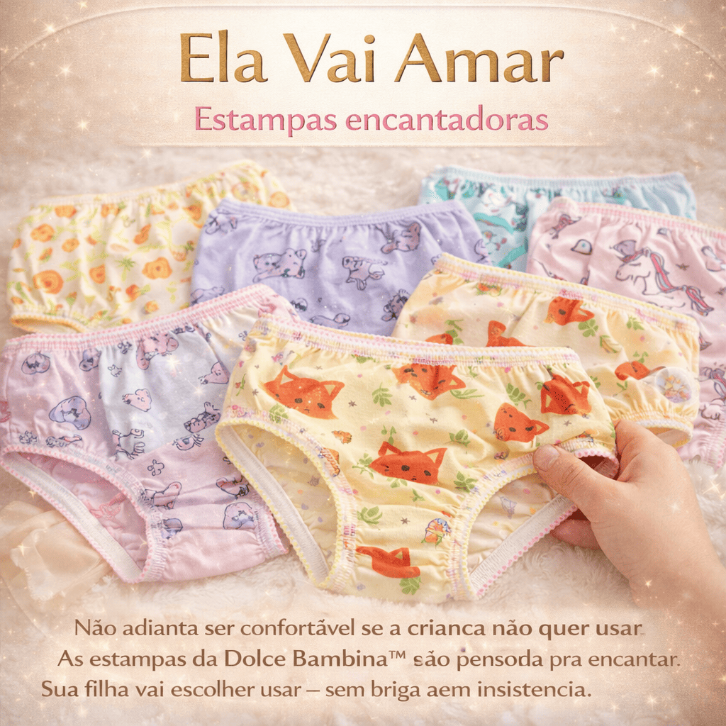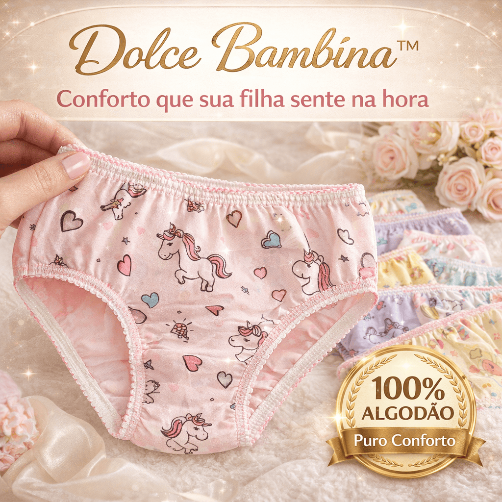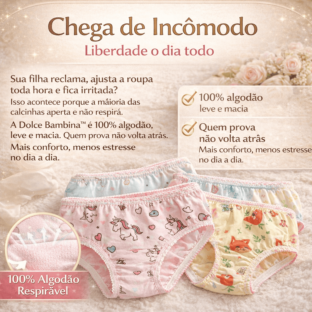 Com a Dolce Bambina™, você elimina esse problema na raiz. Feita com 100% algodão respirável, ela proporciona um toque macio, leve e seguro, que respeita a pele sensível das crianças. Sua filha se sente livre, confortável e feliz — e você sente a tranquilidade de ter feito a escolha certa.
