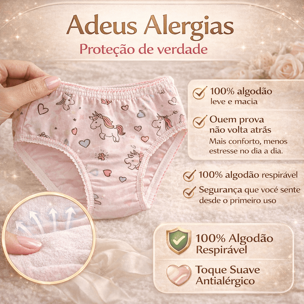 Você já percebeu sua filha incomodada, ajustando a roupa toda hora, reclamando sem saber explicar direito? Isso acontece mais do que parece… e na maioria das vezes, o problema está no tecido errado. Calcinhas comuns abafam, apertam e causam irritações que nenhuma mãe quer ver.