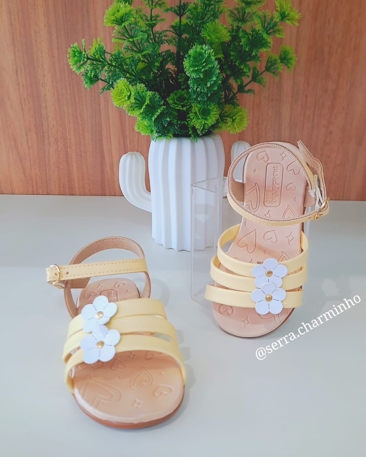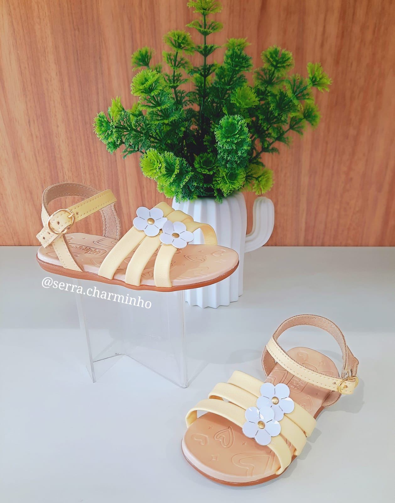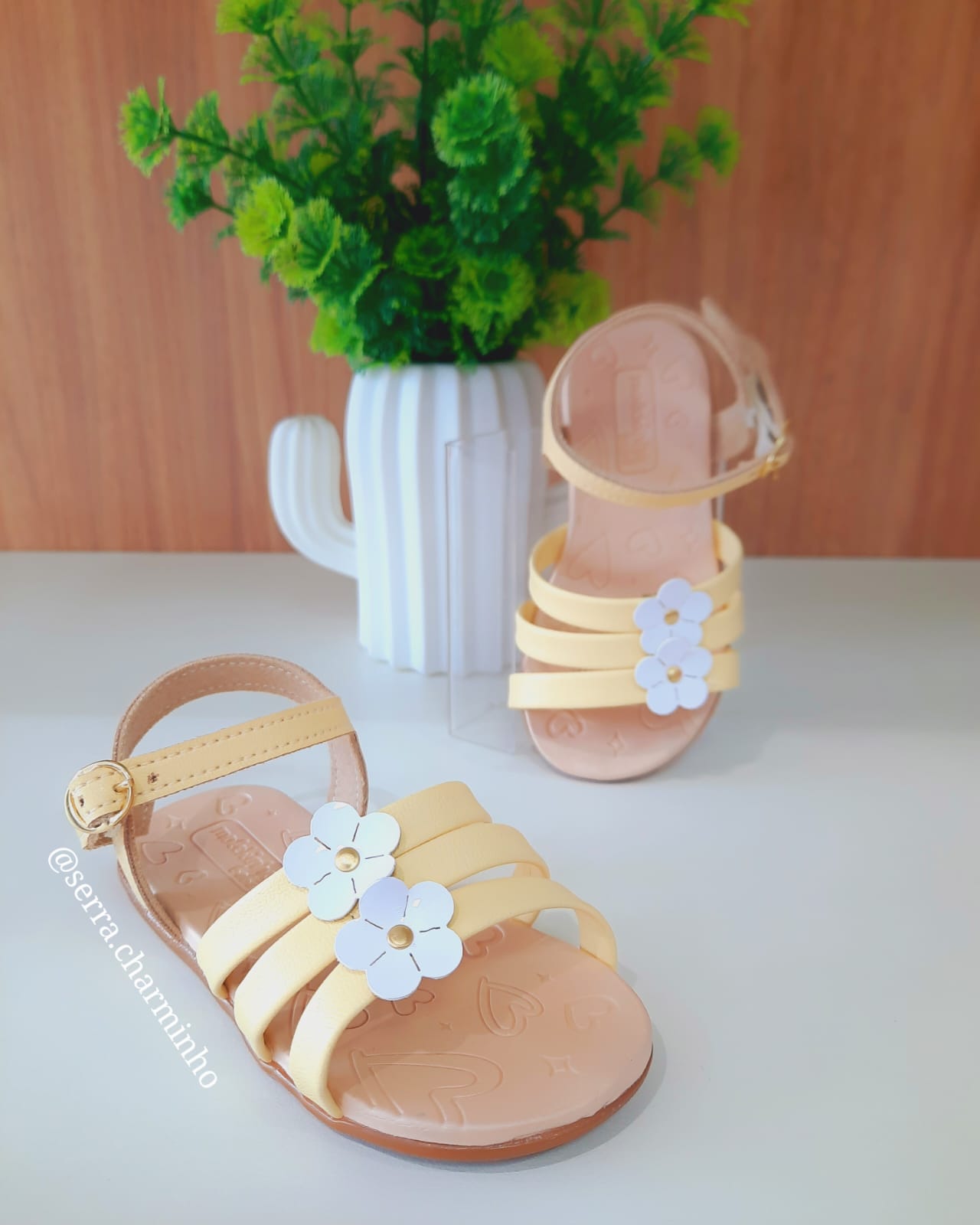 | Tira com Fivela Dourada | Sapato caindo do pé: Ajuste preciso que garante que a sandália não saia enquanto a criança corre. |
